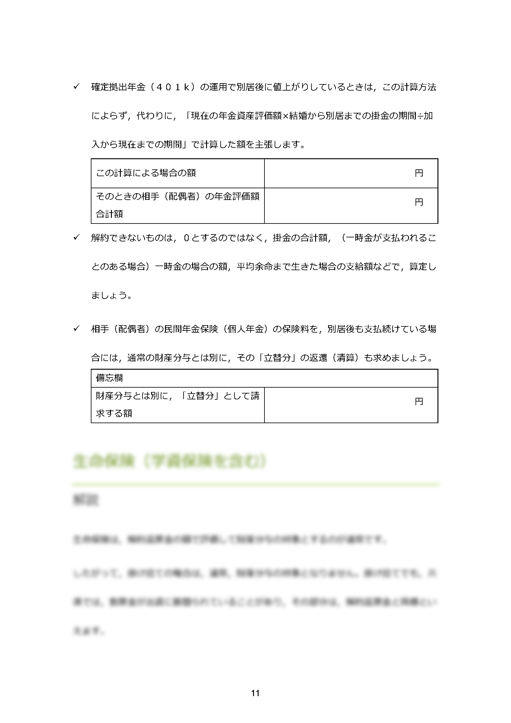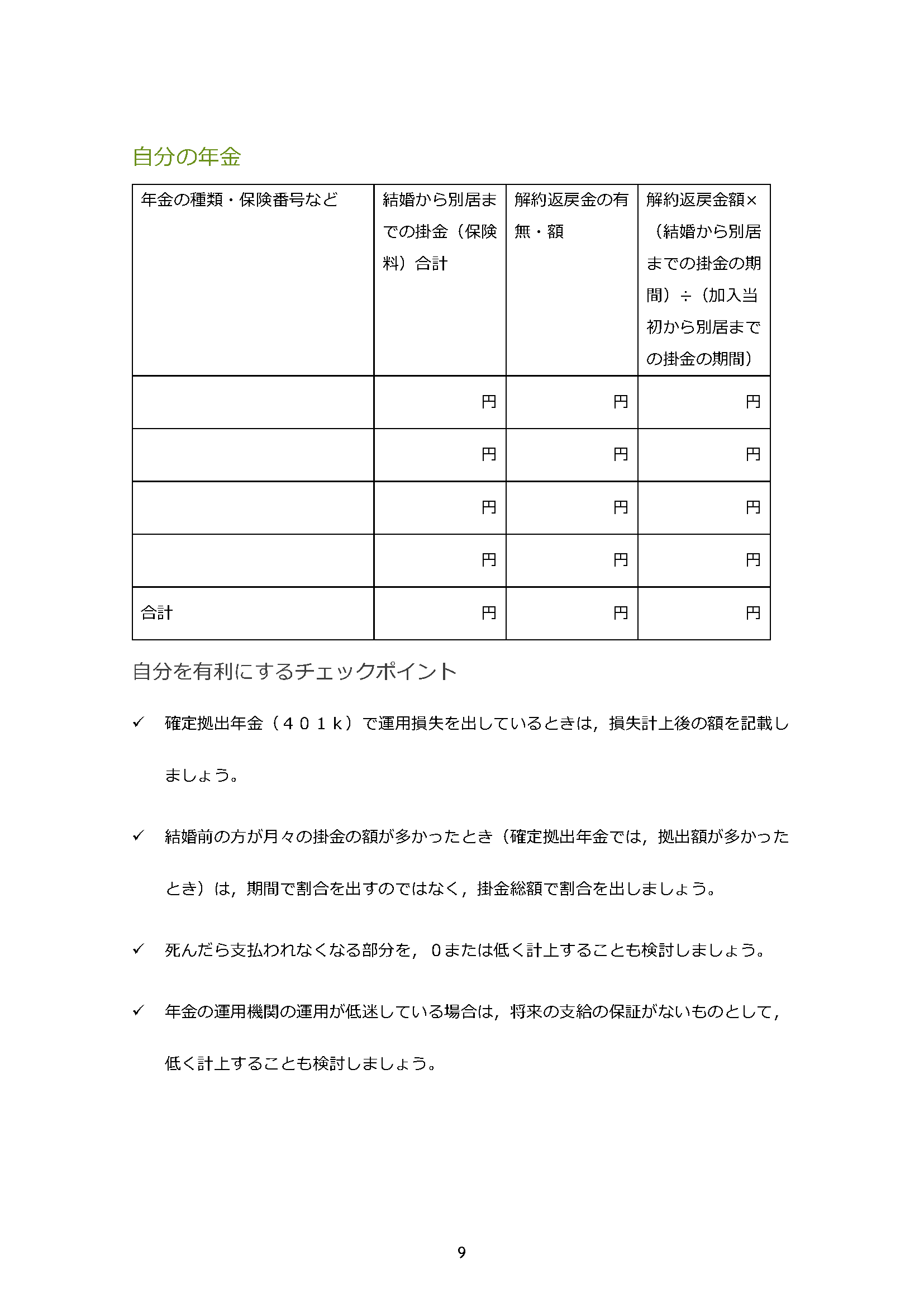 チェックポイントに気をつけながら,財産を記入していくことで,あなたは,自分の財産がいくらあるのか,そのうち,「結婚から別居までに蓄えた財産」ではないものとして除外できるものがいくらあるのか,を把握することができるでしょう。