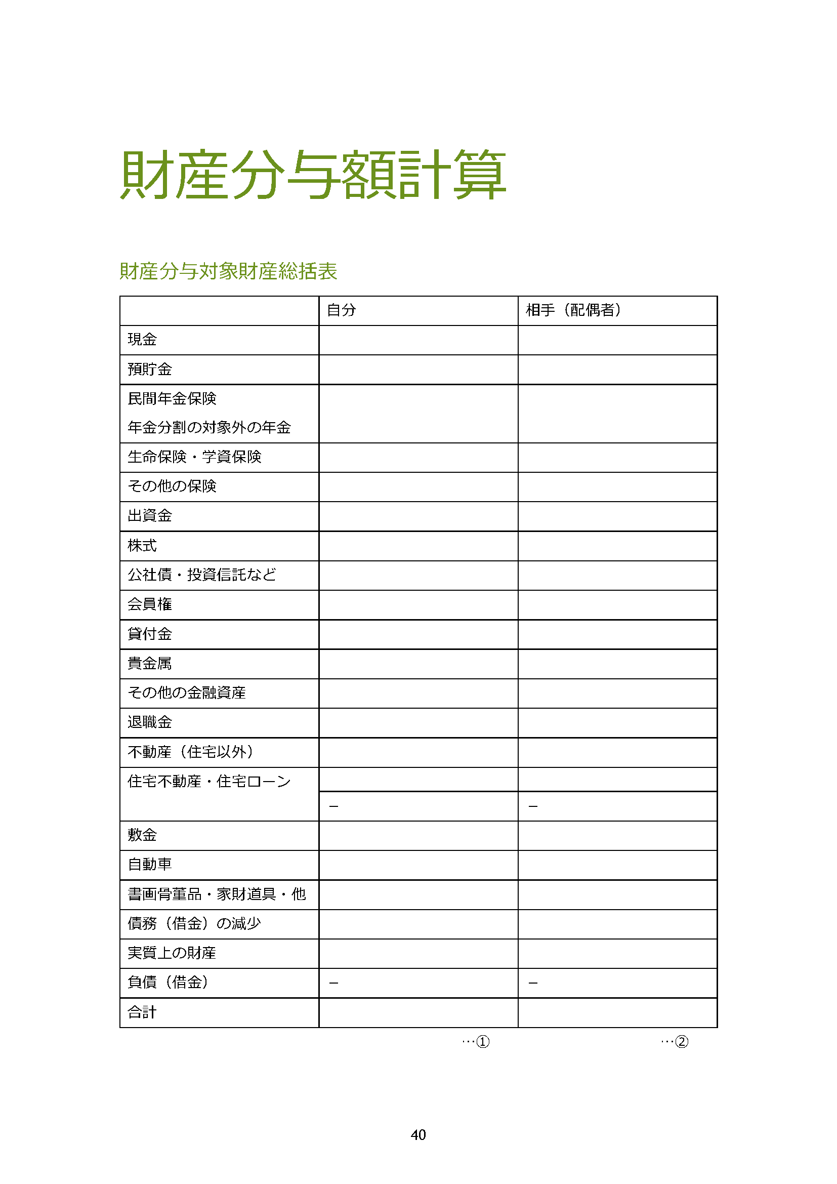 そして,財産を集計して,財産分与の額が計算できる総括表のページもあります。次のページは,総括表の1ページ目です。