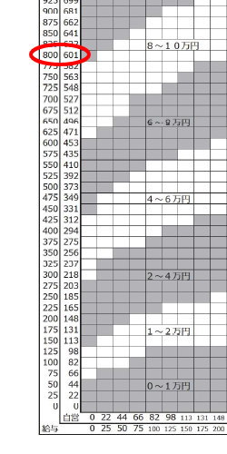 例えば,夫に給与800万円,事業200万円の収入がある場合について,養育費算定表で見ると給与の年収800万円と事業の年収601万円が同じ欄にあることが分かります。そこで,給与800万円を事業601万円に換算し,200万円+601万円=801万円の事業の年収があるものとして,養育費算定表へのあてはめをすることができます。