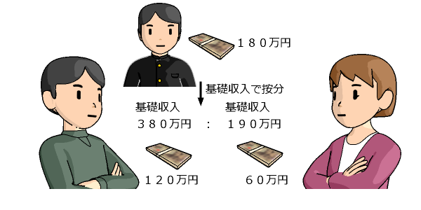 この場合,権利者の分担額は60万円と算出されます(子どもの生活費分180万円を,基礎収入(義務者380万円,権利者190万円)の割合で分けるため)。