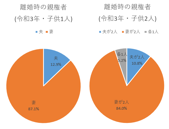 離婚後に共同親権が選択できるようになる前のデータになりますが,令和3年に離婚した夫婦の子供の親権者は次の通りとなっています。80%を超える割合で妻(母親)が親権を取得していますが,父親も親権者になっていることがわかります。